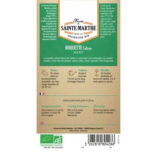 Amusez-vous à cultiver la Roquette Cultivée AB, vous pouvez semer du mois de Mars au mois de Septembre pour une récolte de Mai à Décembre.