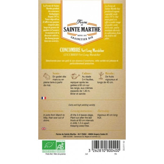 Sur Laboutique420.com, disponible de suite, les graines de Concombre Vert Long Maraîcher reproductibles sont vendues ici en sachet de 20 graines.