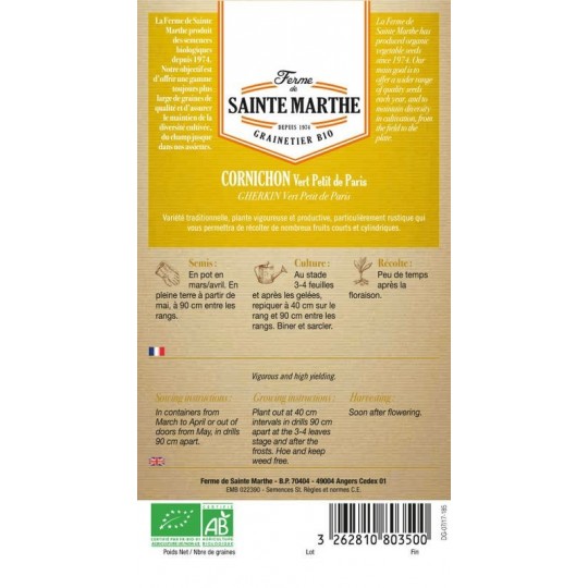 50 graines de Cornichons Vert Petit de Paris AB par sachet sur Laboutique420.com.