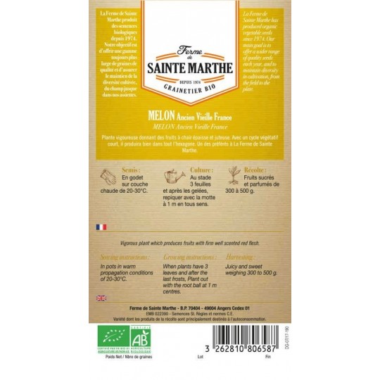 Légume ancien disponible sur Laboutique420.com, avec ces graines de Melon Ancien Vielle France AB disponible en sachets de 15 graines Bio.