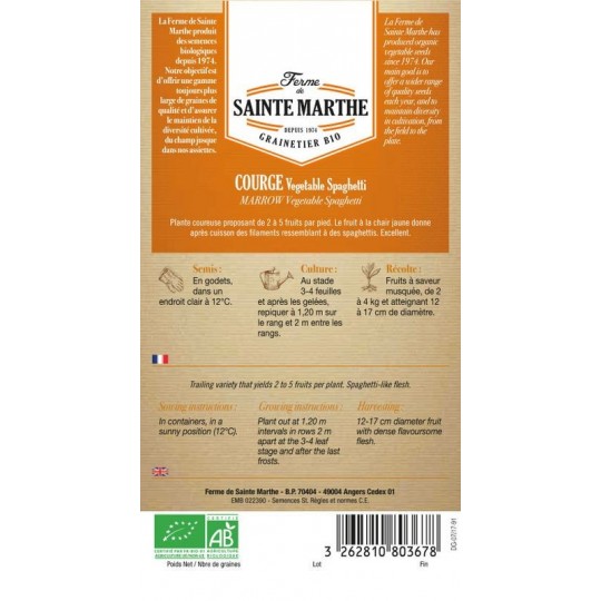 Courge Végétable Spaghetti AB doit son nom à son aspect après cuisson et à sa confection en agriculture Biologique.