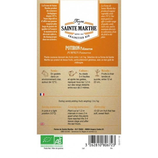 Vendues par sachet de 15, ces graines Bio sont reproductibles. Pour un meilleur résultat, effectuez vos semis d'Avril à Juin, laissez murir tout l'été, vos fruits d'environ 1.5kg seront murs à partir de Septembre/Octobre.