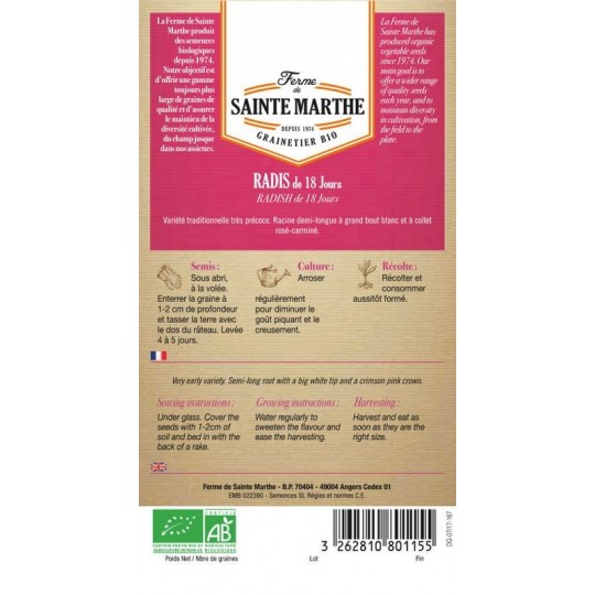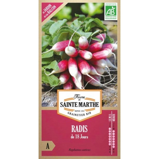 Vous pouvez plnater vos radis de 18 jours AB à partir du mois de Mars jusqu'au mois de Septembre, la récolte se fera 18 jours après semis.
